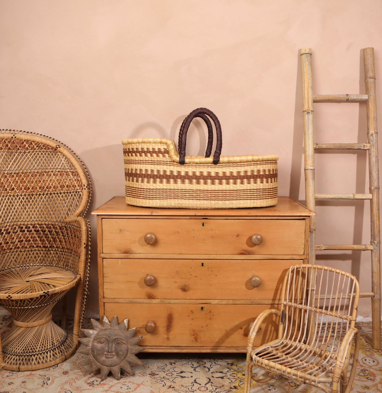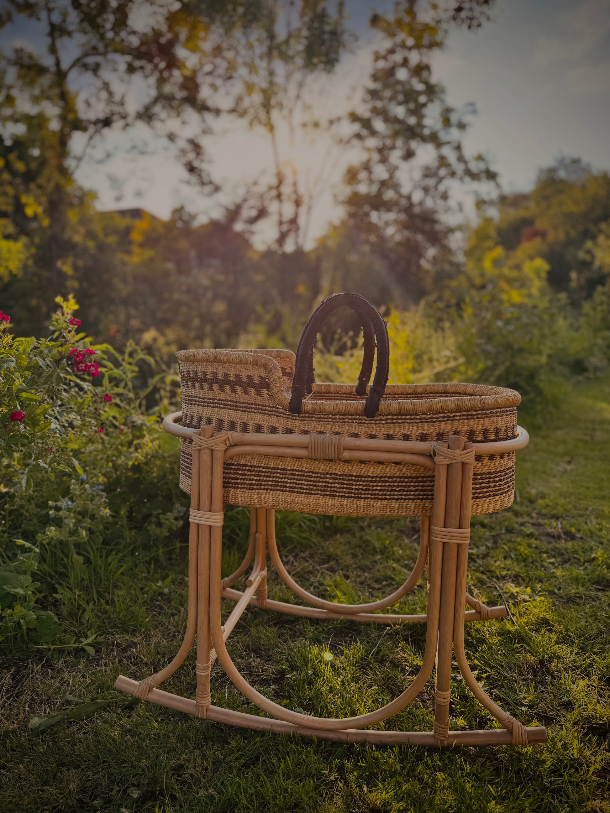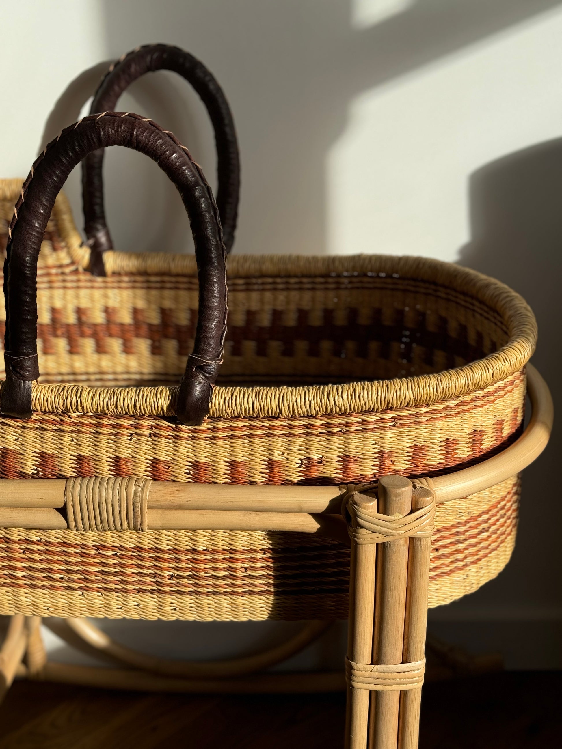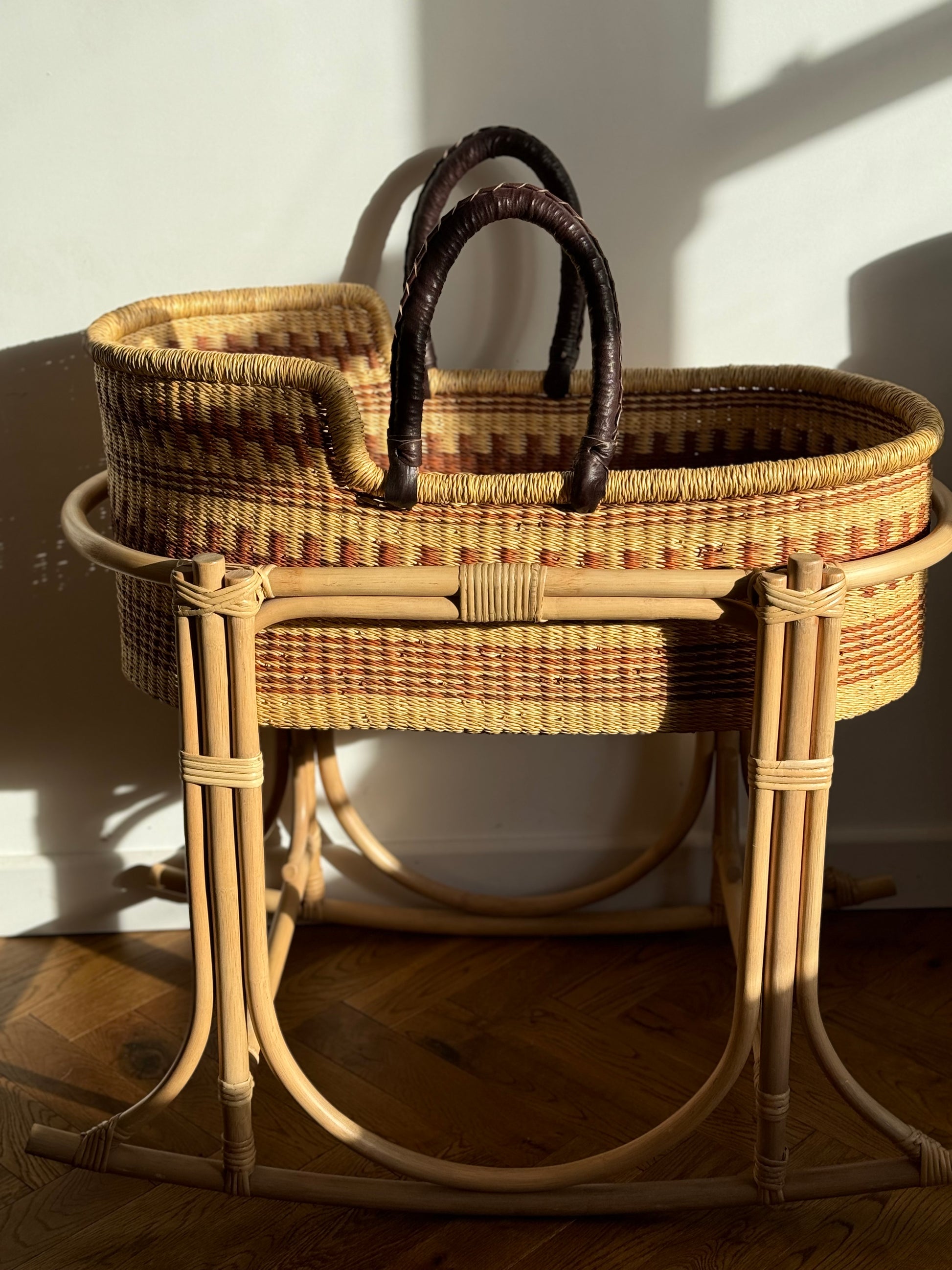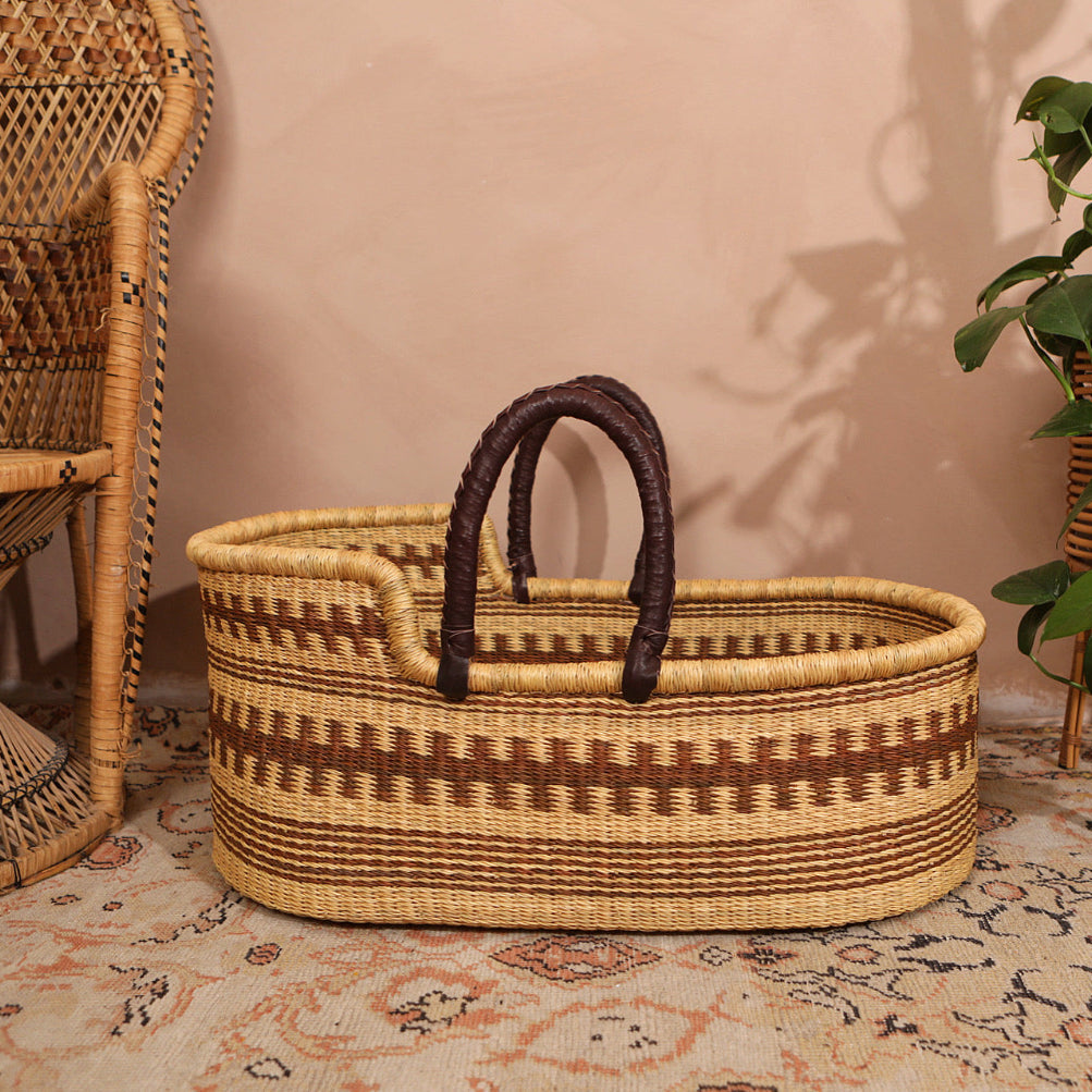 Crafted from durable elephant grass (Pennisetum purpureum), Our Moses baskets are as strong as they are beautiful. Sourced from Ghana, the natural fibers are handwoven with care and finished with soft, dark brown leather handles for added comfort and durability.